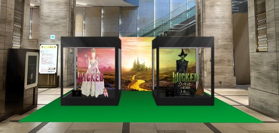 東京ミッドタウン日比谷の地下広場にて、実際に映画『ウィキッド 永遠の約束』の制作を担当したハリウッドのプロダクションチームが、劇中に登場するものと同じ素材、同じサイズで完全再現した衣装が展示されます。エルファバやグリンダの美しいドレス、エルファバのほうき、グリンダの魔法の杖とティアラなど映画の世界に没入できるアイテムが並びます。