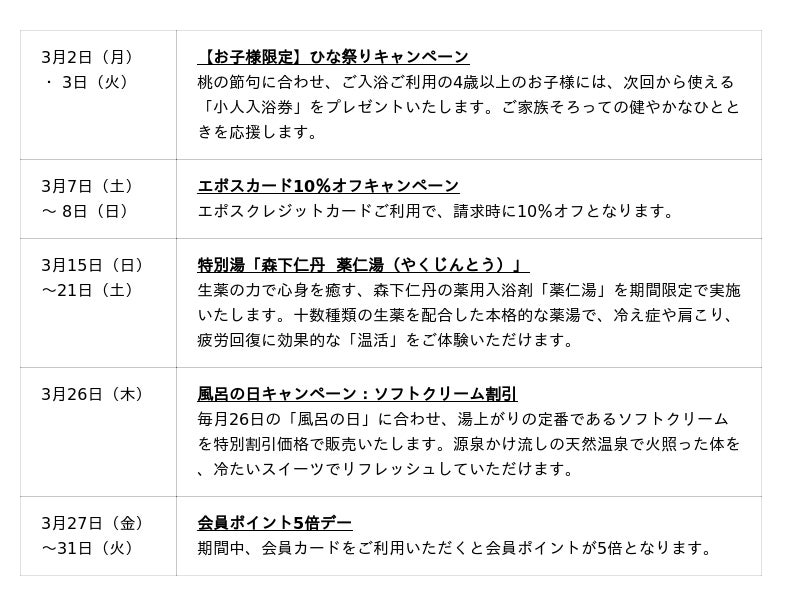 本イベントでは、お子様への入浴券プレゼントや、老舗「森下仁丹」とのコラボ風呂、恒例の「風呂の日」特別割引など、ご家族で楽しめる多彩な企画をご用意。春の訪れとともに、心温まる癒やしの時間をご提供します。