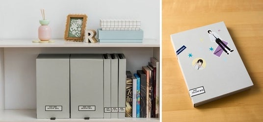 会報誌や雑誌の切り抜き、フォトブックタイプの限定盤アルバムなどをひとまとめに収納できるサイズにこだわりました。インデックスシールが付いており時系列やアーティストごとに分類整理ができて便利です。
