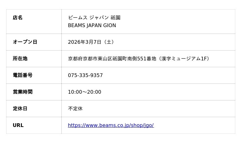 BEAMS JAPANの常設店として11店目となる「ビームス ジャパン 祇園」は、日本を代表する観光地である京都の中心地、八坂神社目前の四条通りに面したロケーションで、「漢検 漢字博物館・図書館」(通称:漢字ミュージアム)の1階に、2026年3月7日(土)にオープンします。同店は京都の企業、株式会社iinaが運営します。