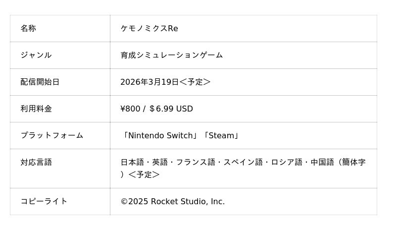 株式会社ロケットスタジオ(本社:札幌、代表取締役:竹部隆司)は、新作ゲーム『ケモノミクスRe』を「Nintendo Switch」ならびに「Steam」にてダウンロード専用ソフトとして2026年3月19日に発売することをお知らせいたします。あわせて、本日よりSteamストアページを公開いたしました。また、発売決定を記念し、公式X(@kemonomix)にてフォロー&リポストキャンペーンを実施いたします。