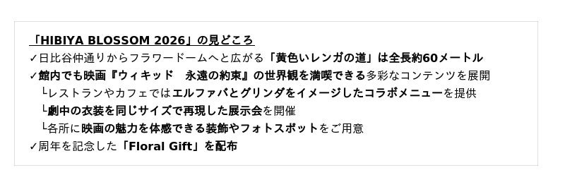 東京ミッドタウン日比谷(千代田区有楽町、事業者:三井不動産株式会社)では、2026年3月3日(火)~4月4日(土)の期間、“アート&フラワー”をテーマに日比谷の街で春の訪れを華やかに祝うイベント「HIBIYA BLOSSOM 2026」を開催いたします。昨年好評を博した映画『ウィキッド ふたりの魔女』とのコラボレーションに続き、今年は続編となる映画『ウィキッド 永遠の約束』(3月6日公開)とのコラボレーションが実現。15,000本を超えるアーティフィシャルフラワーで構成されるフラワードームをはじめ、映画の世界をモチーフにしたチューリップ畑の大階段装飾や、物語を象徴する「黄色いレンガの道」など新たなスポットが登場します。