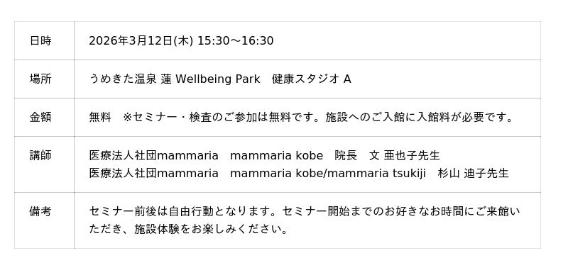 「うめきた温泉 蓮 Wellbeing Park」(総支配人:藤立 達哉、所在地:大阪市)は、2026年3月12日に、医療法人社団mammaria(理事長:尹 玲花、所在地:東京都)より乳腺専門医をお招きし、乳がん啓発を目的とした健康セミナーを開催することをお知らせします。