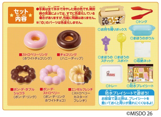 お部屋でもおふろでも遊べる大人気シリーズに、「ミスタードーナツ」が仲間入り。 お湯と氷水を使うだけで、ドーナツの色が変わったり、カラフルな模様が浮き出たりとまるで魔法みたい!人気のドーナツは全部で5種類。それぞれ色変化が楽しめるので、作れるバリエーションは全部で15種類も。トングでお気に入りのドーナツをトレイにのせて、自分だけのオリジナルドーナツを作れます。 本物そっくりのお持ち帰りボックスに入れれば、気分はすっかり店員さんです。商 品 名 :かえちゃOh!! まほうのミスタードーナツ