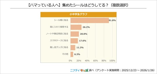 シール集めにハマっている人の9割以上が、「シール帳に貼る」を選びました。その他には、「友達と交換する」という回答も見られました。