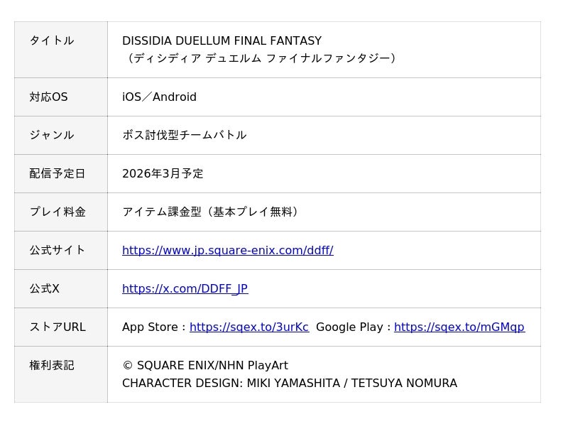 株式会社スクウェア・エニックス(本社:東京都新宿区、代表取締役社長:桐生 隆司、以下スクウェア・エニックス)は、NHN PlayArt 株式会社(本社:東京都港区、代表取締役社長:丁 佑鎭、以下 NHN PlayArt)と共同開発を手掛ける新作スマートフォン向けゲーム『ディシディア デュエルム ファイナルファンタジー』において、本日2月26日(木)よりApp StoreとGoogle Playにて事前登録を開始いたしました。サービス開始時期は2026年3月を予定しております。あわせて、本作のオープニングムービーを公開。さらに、「事前登録開始記念キャンペーン」を開催したことをお知らせいたします。
