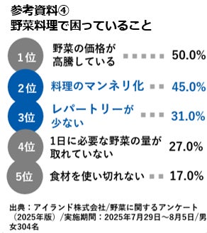 3.野菜摂取意識が高まる一方で、家庭の食事作りにおける野菜料理の「マンネリ化」「レパートリー不足」が課題として顕在化しています