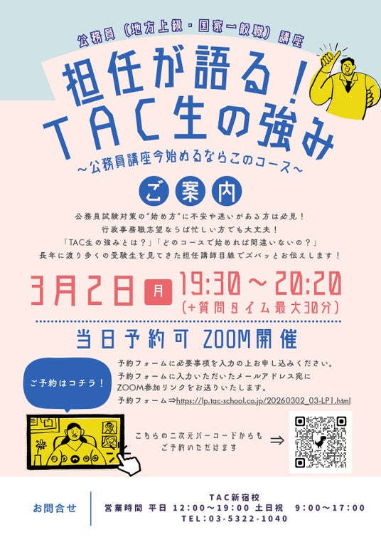 資格取得に向けた教育サービスを展開しているTAC株式会社(東京都千代田区、代表取締役社長:多田 敏男)では、公務員試験を検討されている方へ向けて「担任が語る!TAC生の強み~公務員講座いま始めるならこのコース~」を、オンラインで開催します。