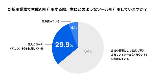 採用業務において利用しているAIツールを聞いたところ、64.0%が「会社や部署として公式に導入されているツール」と回答した一方、29.9%が「個人のAIツール」、6.1%が「両方」と回答しました。個人情報を多く扱う採用業務において、会社や部署で許可されていないAIツールを使っている、いわゆる「シャドーAI」を行っている人は、採用業務でAIを利用している人のうち、3分の1以上にのぼることが明らかになりました。