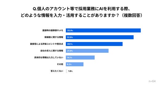 個人のツールを利用している人に、どのような情報を入力しているか聞いたところ、最も多いのは「面接時の議事録やメモ」で35.9%、続いて「候補者に関する情報」が32.8%、「面接官による評価コメントや懸念点」が28.1%となり、いずれも選考に関わる具体的な個人情報が上位を占める結果となりました。