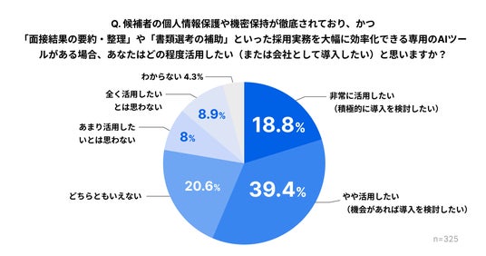 セキュリティと効率化を両立できる専用AIツールの利用意向を尋ねたところ、18.8%が「非常に活用したい」、39.4%が「やや活用したい」と回答し、約6割が候補者の個人情報保護の徹底と、採用実務の効率化の双方を実現できるAIツールに対して前向きな様子が伺えました。