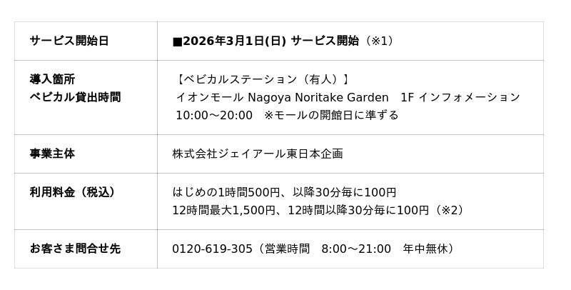 ○この度、「イオンモール Nagoya Noritake Garden」で3月1日よりサービスを開始します。ベビーカーは、お子さまに人気の923形ドクターイエローベビーカーを貸出いたします。