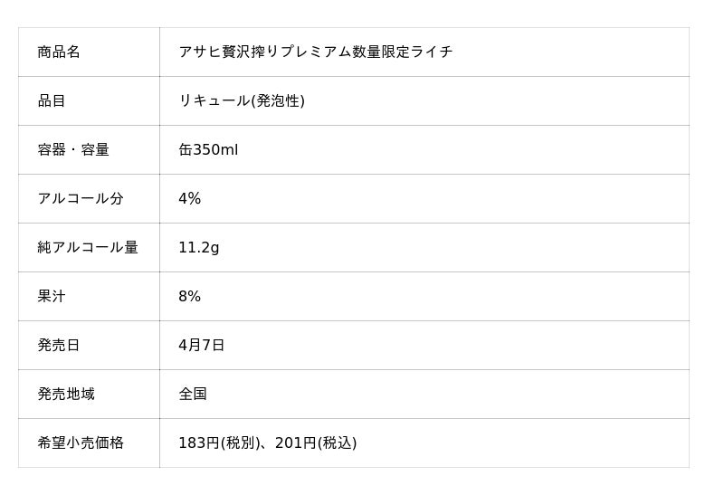 アサヒビール株式会社(本社 東京、社長 松山一雄)は、RTD※「贅沢搾り」ブランドの“プレミアム”シリーズ『アサヒ贅沢搾りプレミアム数量限定ライチ』を4月7日から数量限定で発売します。