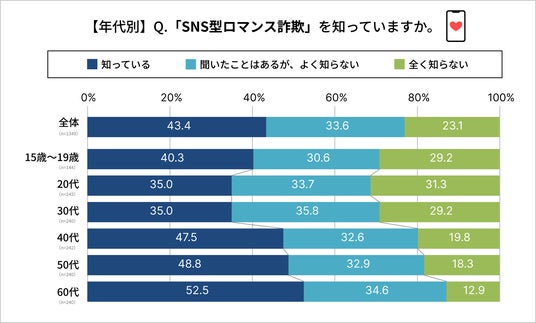 40代以上では約5割前後が「知っている」と回答しており、年代が上がるほど認知度が高まる傾向がみられます。SNS型ロマンス詐欺の被害が多い年齢層とも重なっており、関心の高さがうかがえます。