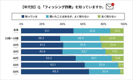 年代ごとの認知度に著しく大きな差はないものの、SNS型投資詐欺の被害が多い年齢層である40代~60代で相対的に認知度が高い傾向があります。
