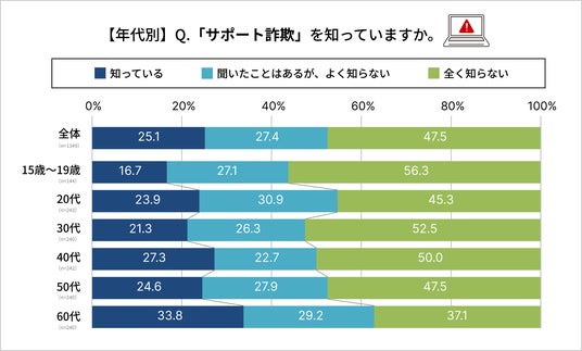 認知度が全体的に低い結果となったサポート詐欺は、特に10代で56.3%が「全く知らない」と回答しており、若年層での認知不足が顕著です。