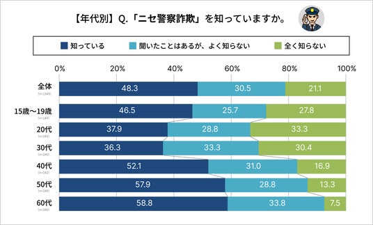 一方で、ニセ警察詐欺の被害件数が最も多い30代・20代では、「全く知らない」が3割を超えています。被害が特に多発している世代で手口の認知が十分に広がっていない“ギャップ”が存在することがわかりました。