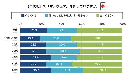 マルウェアについては、いずれの年代においても認知・理解が十分に浸透しておらず、今後さらなる周知・理解促進が求められます。