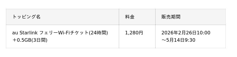 KDDI、沖縄セルラーは2026年2月26日から、povo2.0の「コラボトッピング」として、初登場となる「au Starlink フェリーWi-Fiチケット(24時間)」と「0.5GB(3日間)」がセットになったトッピングを1,280円で提供します。