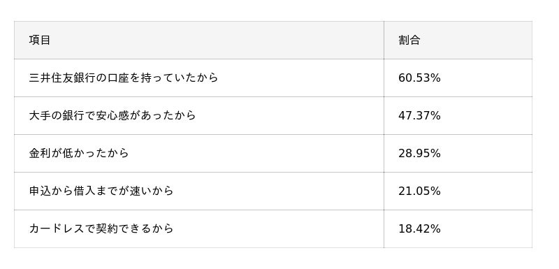 - 選んだ理由として「三井住友銀行の口座を持っていたから(60.53%)」が最多。次いで「大手の安心感(47.37%)」が挙がっており、既存ユーザーの利用のしやすさとメガバンクの安心感が、申し込みの動機となっている。