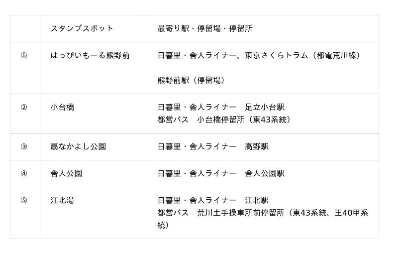 都営バスマスコット「みんくる」&東京さくらトラム(都電荒川線)マスコット「とあらん」と、日暮里・舎人ライナーや都営バス沿線のスポットを巡るスタンプラリーです。5か所のスポットを探し出し、そのスポットをスマートフォンで撮影するとスタンプが獲得できます。すべてのスタンプを集めた方には素敵な景品を差し上げます。