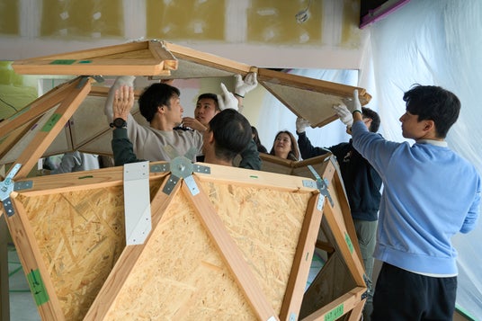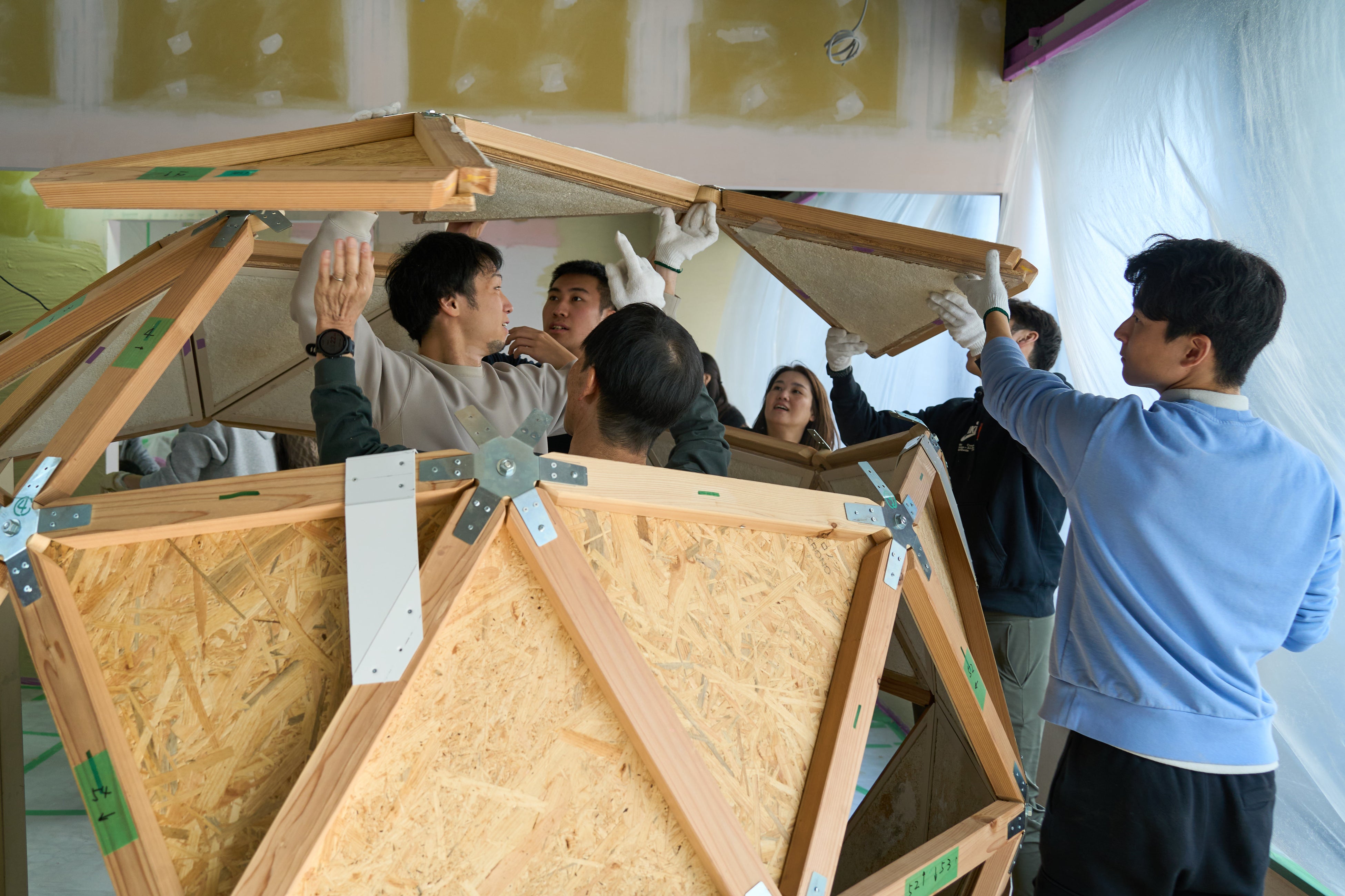 資材の活用にあたり、当社は2026年2月14日にDIYイベントを実施しました。社員とその家族が参加し、万博で使用された資材を新オフィスの空間へと再構成しました。