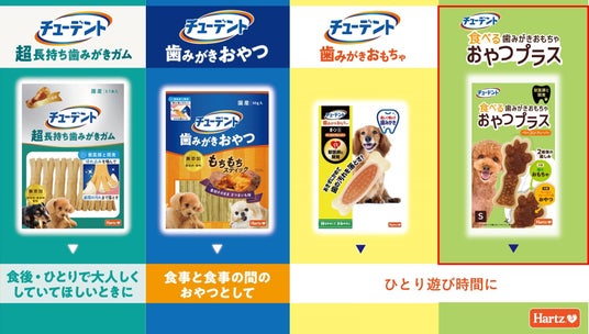 このような課題に対して、愛犬用デンタルケアブランド「Hartz(R) チューデント」は、2025年春に「すべてのワンちゃんが一生噛める歯を目指して。」をブランドビジョンに掲げ、リニューアル。ガムとおもちゃを併用した「飼い主様にも愛犬にも負担が少ない歯みがき習慣」をご提案してまいりました。
