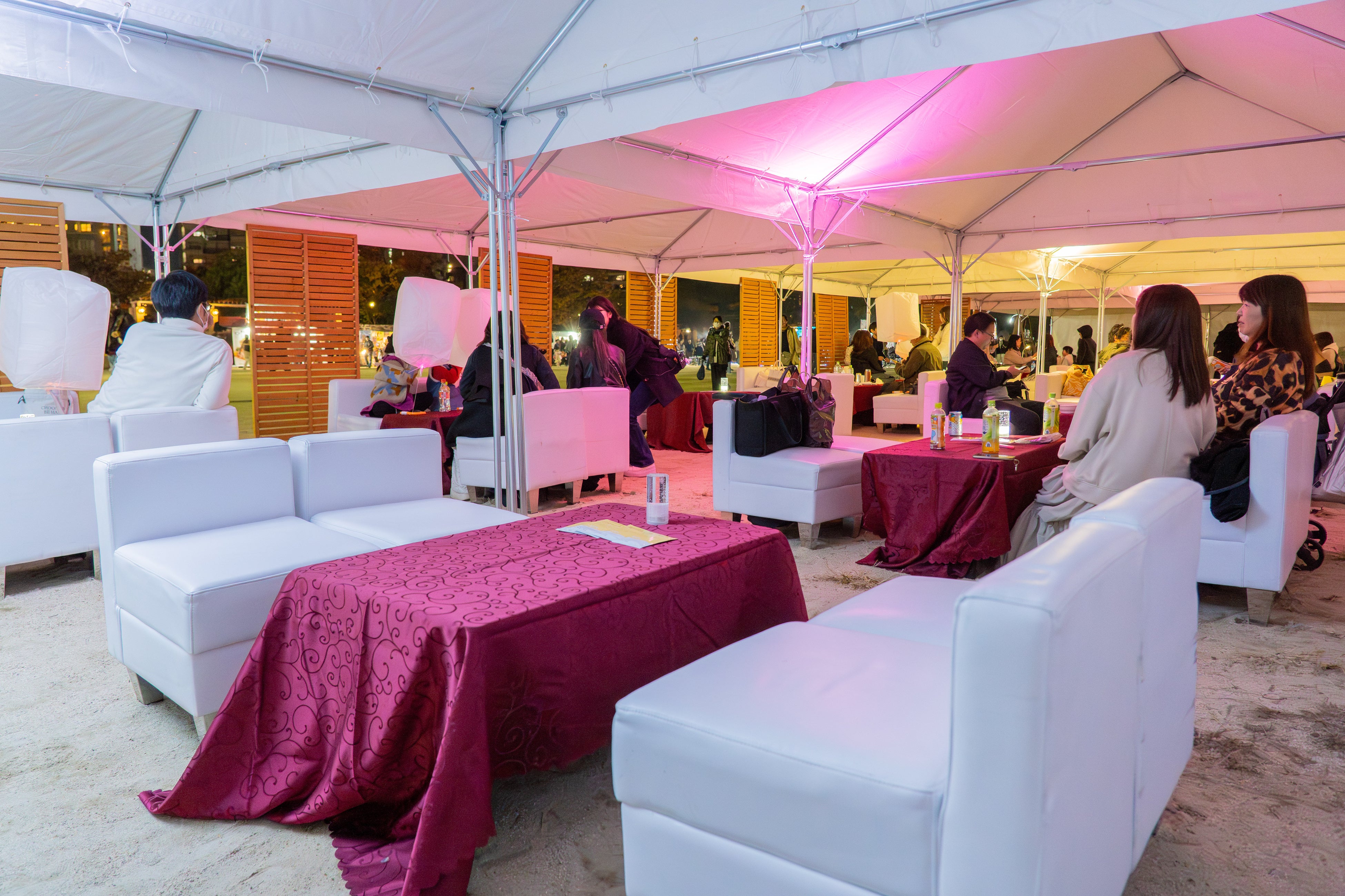 大きなテントの下、4名掛けのソファでくつろぎながら、夜空を彩るカラフルなランタンを楽しめる特別席。落ち着いた空間で仲間やご家族と一緒に、幻想的な光景を心ゆくまでご堪能いただけます。