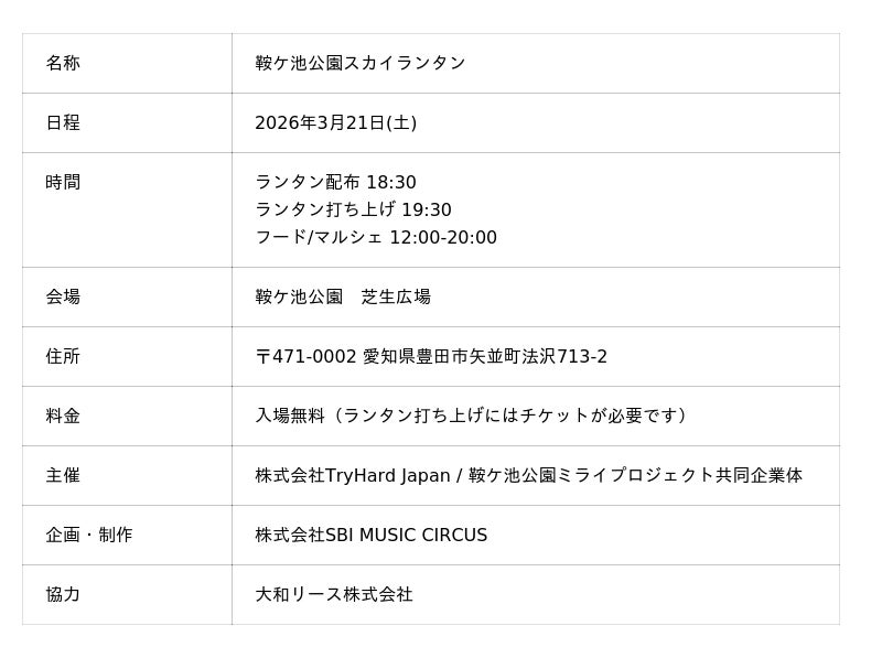株式会社SBI MUSIC CIRCUS、(本社:東京都港区、代表取締役社長:大付 楽洋、以下「当社」)は、2026年3月21日(土)に鞍ケ池公園 芝生広場にて開催される体験型ランタン打ち上げイベント「鞍ケ池公園スカイランタン Vol.2」を開催いたします。