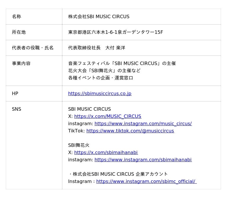 株式会社SBI MUSIC CIRCUSは、「エンタテインメントの力で、世界一笑顔を届ける」をミッションに掲げ、国内最大級の音楽フェスティバル「SBI MUSIC CIRCUS」や、関西最大級の花火大会「SBI舞花火」などを手掛けています。