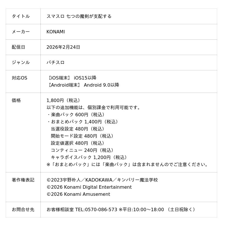 株式会社コナミアミューズメントは、『スマスロ 七つの魔剣が支配する』のシミュレータアプリ(App Store、Google Play)を配信開始したことをお知らせします。