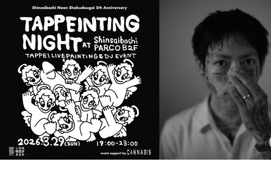 大阪にルーツを持ち、オリジナリティの高いタッチでファッションや音楽といったシーンでも注目を集める TAPPEI を迎え、心斎橋ネオン食堂街 5 周年を記念した一夜限りのスペシャルイベントを開催。心斎橋ネオン食堂街の一角で繰り広げられるライブペインティング。CANNABIS がキュレーションする DJ セッション。それぞれの熱が交錯し、アートと音楽が共鳴する夜の空間が立ち上がる。完成された作品だけでなく、その瞬間にしか生まれない熱量と空気感までもが、5 周年の記憶として心斎橋ネオン食堂街に刻まれる。
