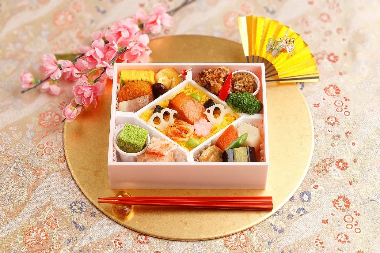 桃の節句を彩る、菱形の華やかな二段重。彩り豊かなちらし寿司に京都の菜の花や筍などの旬野菜、桜香る道明寺を添え、ひな祭りのひとときを演出します。