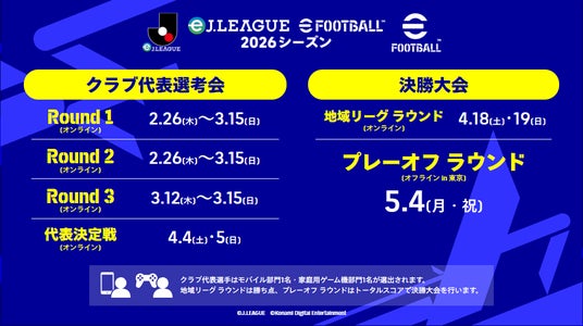 公益社団法人 日本プロサッカーリーグ(以下、Jリーグ)と株式会社コナミデジタルエンタテインメント(以下、KONAMI)は、基本プレー無料で家庭用ゲーム機、PC、モバイルで配信中の『eFootball(TM)』を競技タイトルとした公式eスポーツ大会「eJリーグ eFootball(TM) 2026シーズン」のオンライン予選を、本日2月26日(木)に開始したことをお知らせします。