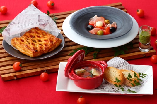 トマトのフードメニュー3 種(ハニーパイ・カプレーゼ・アヒージョ)