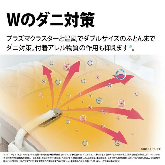 本製品は、プラズマクラスターと温風を組み合わせたWのダニ対策が特長のふとん乾燥機です。温風でふとん内部をしっかり乾燥させながら、プラズマクラスターで清潔ケア。さらに、ふとんや洗えない枕に付着したニオイも消臭できます。