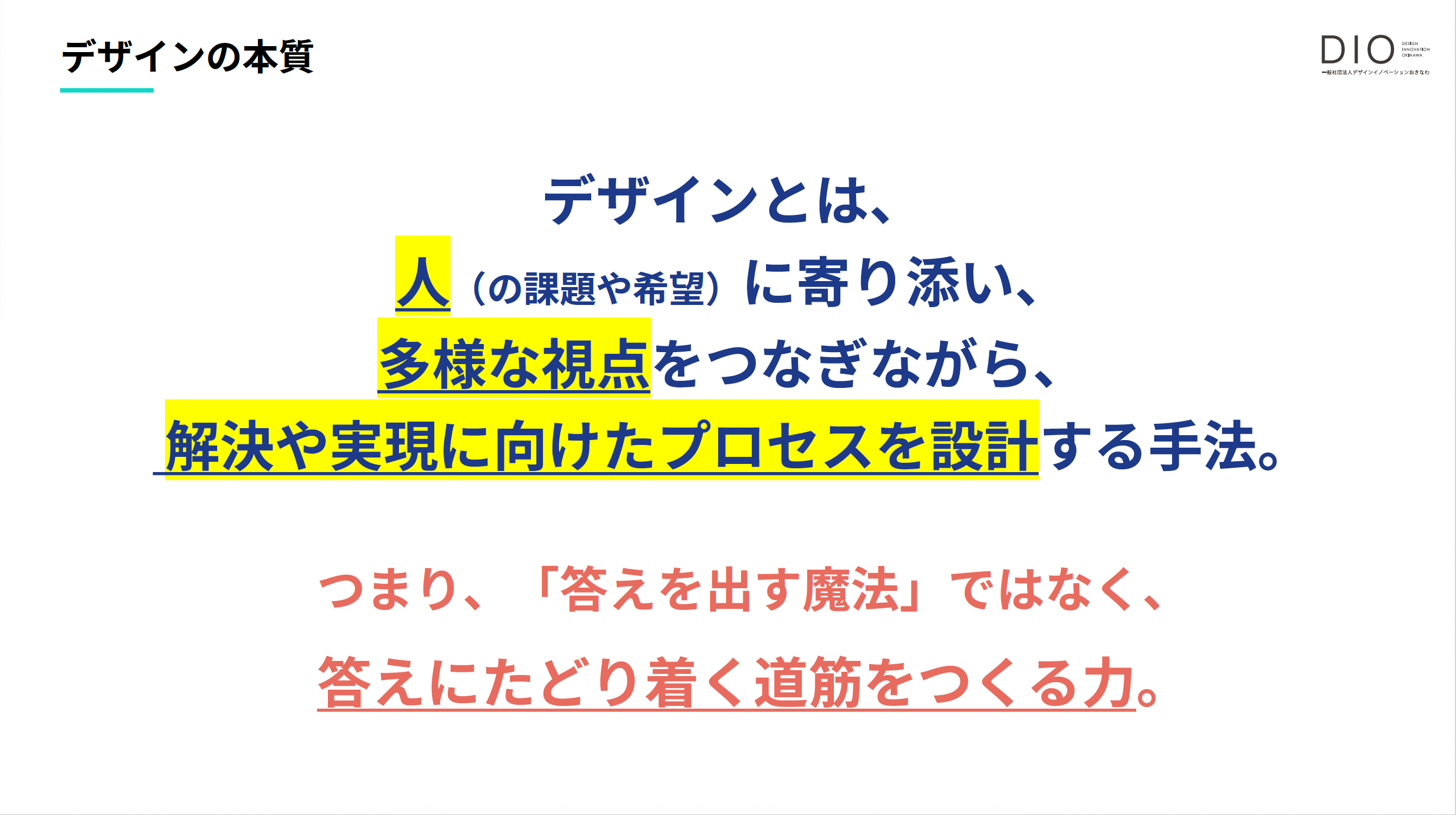 デザインを「見た目を整えること」から明確に拡張して捉えている点に言及。DIOが扱うデザインは課題を起点にして価値を生み出すために、つまり、デザインを「見た目」ではなく「動く仕組み」として捉え直します。・何を価値として定義するか(問いを立てる)
