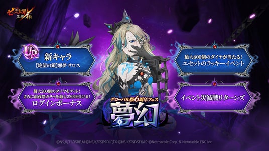新キャラUR【絶望の鎖】悪夢 サロスが登場する、「グローバル版6周年フェスガチャ~夢幻~」を開催いたします。