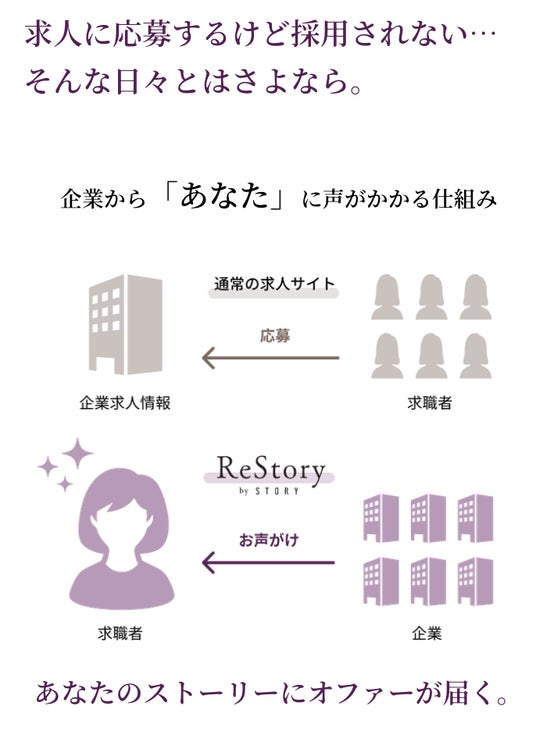 これまでの転職活動では企業から発信される求人情報に求職者が応募する形がほとんどでしたが、これからは少子化の影響もあり採用が困難を極める時代。人材を逆に企業が取り合う時代がやってきています。そこでReStoryでは「求職者」の方のこれまでとこれからのストーリーを届け、企業から「この人と働きたい」とオファーをいただく『スカウト型』の人材プラットフォームを開発しました。