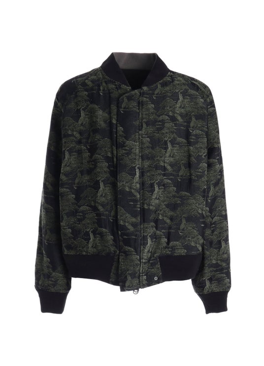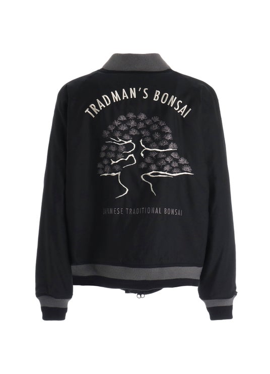 リバーシブルブルゾンは、背面に五葉松模様木-銘「501」をグラフィカルなデザインに変え、モノトーン調で大胆に刺繍を施しました。裏地には、五葉松、黒松、真栢模様木といったTRADMAN’S BONSAIが誇る名株をコラージュし、ジャガード織によって構築された総柄で、一見迷彩柄のようにも映るユニークなテキスタイルデザインに仕上げています。