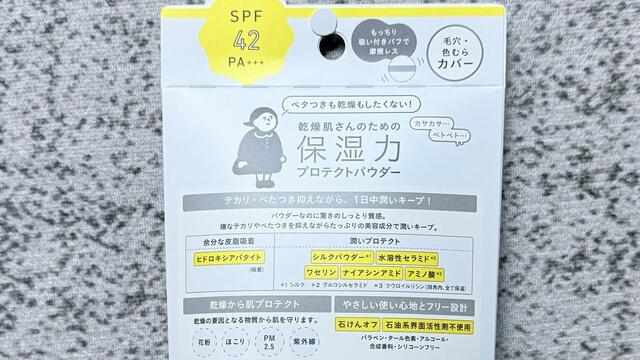 保湿力プロテクトパウダーには、シルクパウダー、水溶性セラミド、ワセリン、ナイアシンアミド、アミノ酸などの潤いプロテクト成分が含まれています。