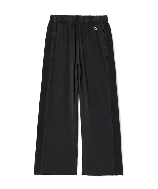 脇部分を裏毛に切り替えたイージーパンツです。素材には、N.HOOLYWOODと共同製作したオリジナルの裏起毛素材と、定番の肌触りの良いコットン100%の天竺素材を使用。股下にはガゼットクロッチを配し、可動域を広げることで動きやすさを確保しています。裾はロックミシン処理で軽やかに仕上げ、両脇にはスラッシュポケットを備えています。ウエストには平ゴムを内蔵し、さらにドローコードを付属することでフィット感の調節が可能です。右ヒップポケット上にはChampionのCロゴを刺繍し、左ポケット横にはチャンピオンのCロゴワッペンを配置。ワイドのストレートシルエットです。ガーメントダイ加工により、ヴィンテージの表情を再現しています。