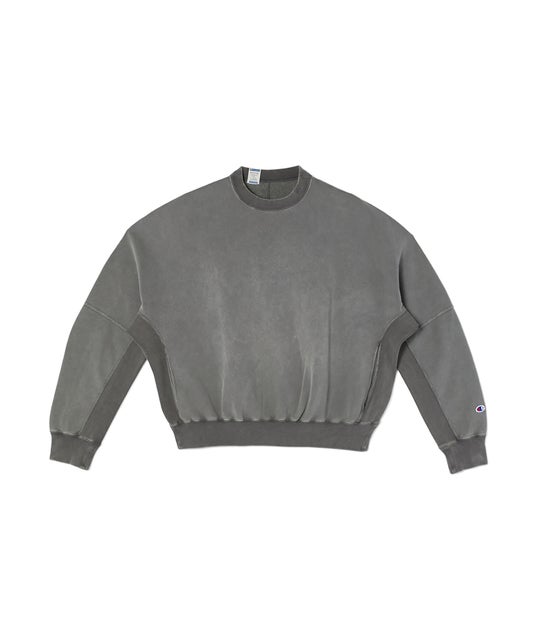 Championを代表する製法「REVERSE WEAVE(R)」を再構築。素材には、N.HOOLYWOODと共同製作したオリジナルの裏起毛素材と、定番の肌触りの良いコットン100%の天竺素材を使用。リバーシブル仕様で、片面は無地、もう一面は切り替えデザインで構成し、身体に沿う立体裁断で組み上げました。サイドから一枚で構成したスリーブにマチを入れ、可動域を高めて快適な着心地に仕上げたクルーネックスウェットシャツです。ネックにはChampionのCロゴ刺繍を施し、左袖にはCロゴワッペンを配置。背面ネックには、N.HOOLYWOODとChampionのロゴを組み合わせた専用タグが特徴です。身幅を広くとったゆとりのあるボックスシルエットに仕上げています。ガーメントダイ加工により、ヴィンテージの表情を再現しています。