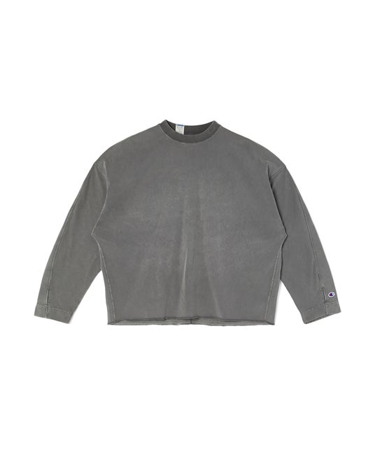 Championを代表する製法「REVERSE WEAVE(R)」を再構築。素材には、N.HOOLYWOODと共同製作したオリジナルの裏起毛素材と、定番の肌触りの良いコットン100%の天竺素材を使用。リバーシブル仕様で、片面は無地、もう一面は生地を切り替えたデザインで構成し、裾にはリブを用いず、リラックスした印象に仕上げたロングスリーブシャツです。袖先にはアームホール付きです。ネックにはChampionのCロゴ刺繍を施し、背面にはCロゴワッペンを配置。背面ネックには、N.HOOLYWOODとChampionのロゴを組み合わせた専用タグが特徴です。身幅を広くとったボックスシルエットに仕上げています。ガーメントダイ加工により、ヴィンテージの表情を再現しています。