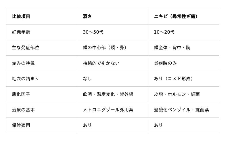 酒さとニキビを見分けるポイントは大きく3つあります。第一に、酒さの赤みは「持続的」であり、ニキビのように炎症が治まれば引くものではありません。第二に、酒さはアルコール摂取、温度変化、紫外線、ストレスなどで悪化しますが、ニキビは皮脂や毛穴の詰まりが主な原因です。第三に、酒さは30代以降に発症することが多く、思春期に発症するニキビとは年齢層が異なります。