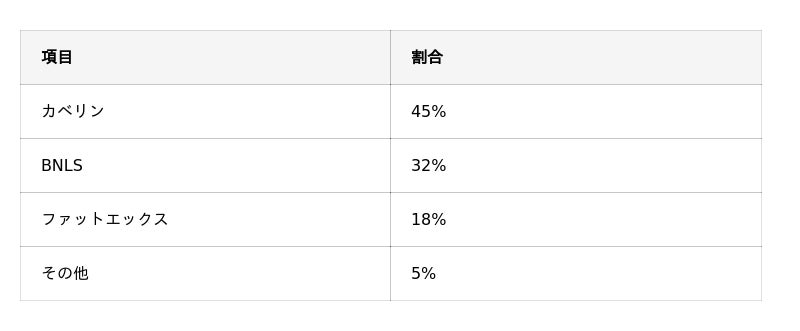 - 使用薬剤は「カベリン」が45%で最多(BNLS32%、ファットエックス18%)