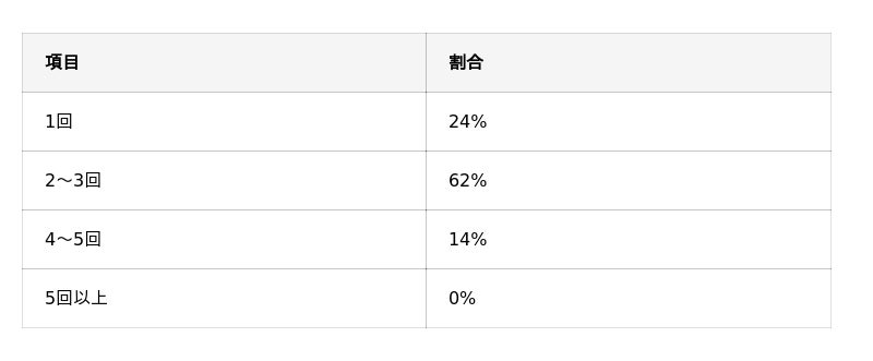 「2~3回」が62%で最も多く、「1回」は24%、「4~5回」は14%でした。