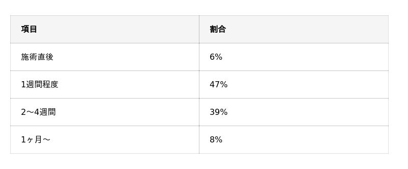 「1週間程度」が47%で最多、「2~4週間」39%と続きました。多くの方が施術後1週間~1か月以内に効果を実感している傾向が見られます。