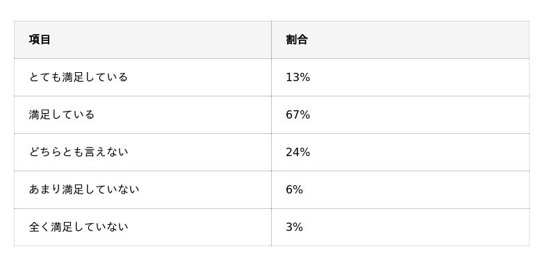「満足している」67%、「とても満足している」13%で、満足層は合計80%でした。一方で「どちらとも言えない」24%という回答も一定数見られました。