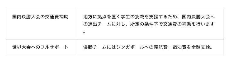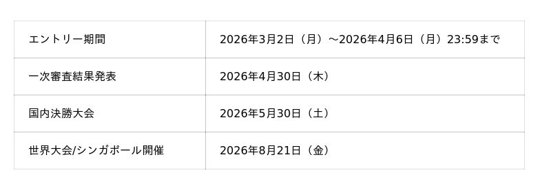 昨年同様、優勝チームには、2026年8月にシンガポールで開催される世界大会(*1)への出場権が授与されます。実行委員会では、海外渡航・宿泊費を全額負担するほか、国内決勝大会においても、遠方地域から参加する学生への交通費補助制度を設けております。これにより、居住地にかかわらず全国の学生が等しく世界へ挑戦することが可能です。